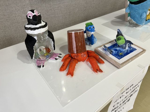 こちらも個性が見られます。こちらのグループでは、白い紙粘土に水色の絵の具を直接塗るのではなく、混ぜ込んで練り上げるというコダワリっぷり!作者は「結果そんなに変わらなかったかもしれませんね~」と、謙遜しながら語ってくれましたが、近くで見ると違いが感じられます。奥のかわいらしいモニュメントと、シンプルかつ迫力のイルカも味があります。黄色い目!