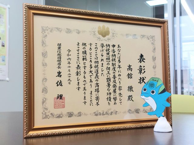 多年に渡る申告納税制度の普及発展に尽力し、関東信越国税局長表彰を受賞しました