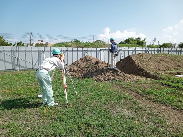 レベル(測量機)を使って基準高から高低差を計算で出します。初めてにしてパーフェクトだったそうです!