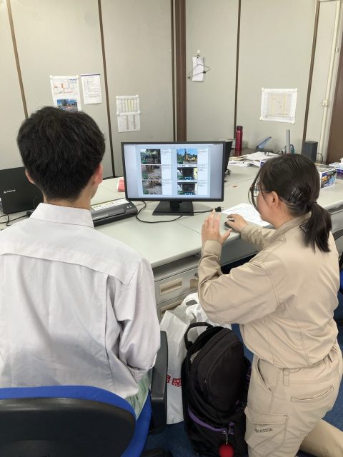内業では現場写真の管理について先輩から学びました。説明上手な新入社員のTさん!