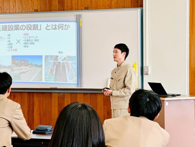 弊社2名のスタッフからは、それぞれの携わる立場から建設業で働くイメージや実体験に基づくエピソード等を生徒の皆さんに説明させて頂きました。
