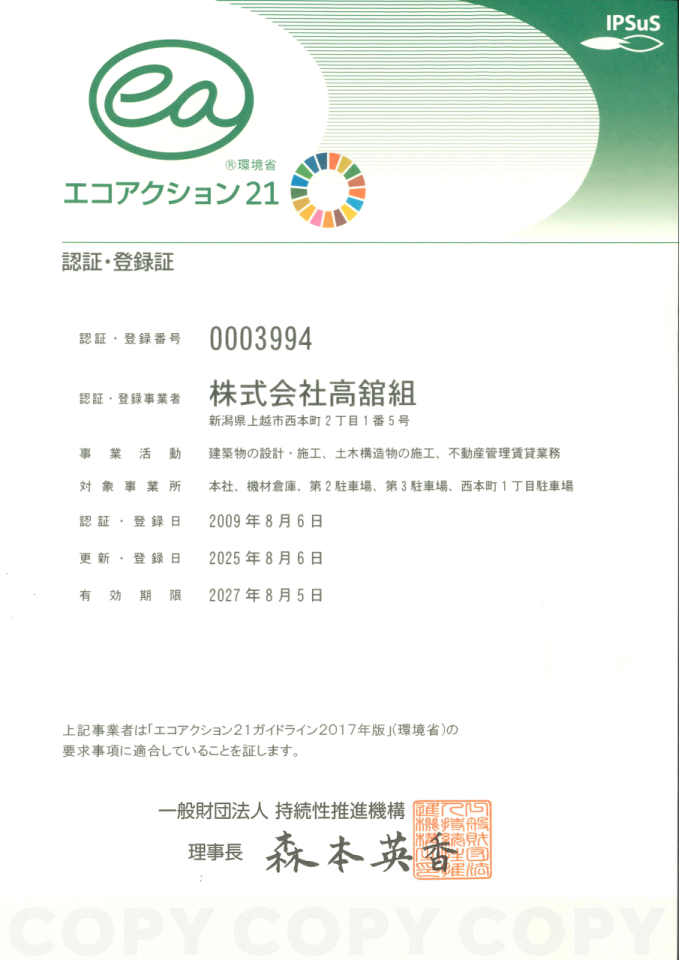 当社は、実施する建設工事のあらゆる企業活動において環境保全に配慮し、持続可能な社会の実現に寄与していく。