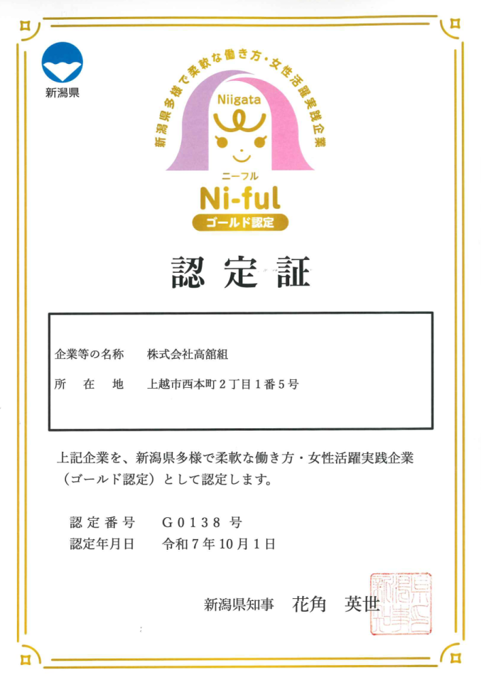 新潟県による男女がともに働きやすく、仕事と家庭生活等が両立できるよう職場環境を整えたり、女性労働者の育成・登用などに積極的に取り組む企業等を登録、支援する制度です。労働基準法など関連法令の順守、育児・介護に関する休業支援などの取組によって認定されました。