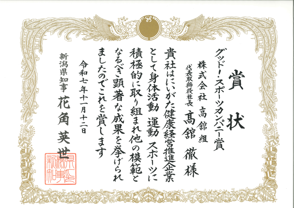 新潟県が従業員によるスポーツ活動を奨励する取り組みや、スポーツ分野における社会貢献活動を実施している企業等を認定し、その取組を支援する制度です。当社の地域のスポーツ大会への参加や協賛、県立武道館のPFI事業などの取組が認定されました。